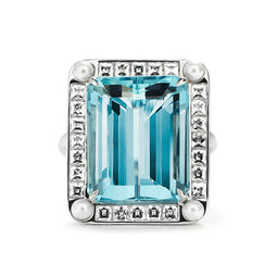 Embolden yourself with the spirit of The Renaissance. Medici adorns the hand with a five carat pale-blue aquamarine, beautifully framed with diamonds set into blackened platinum. This cocktail ring employs vintage design elements but remains modern in execution, the platinum band featuring our signature “hourglass” shape.